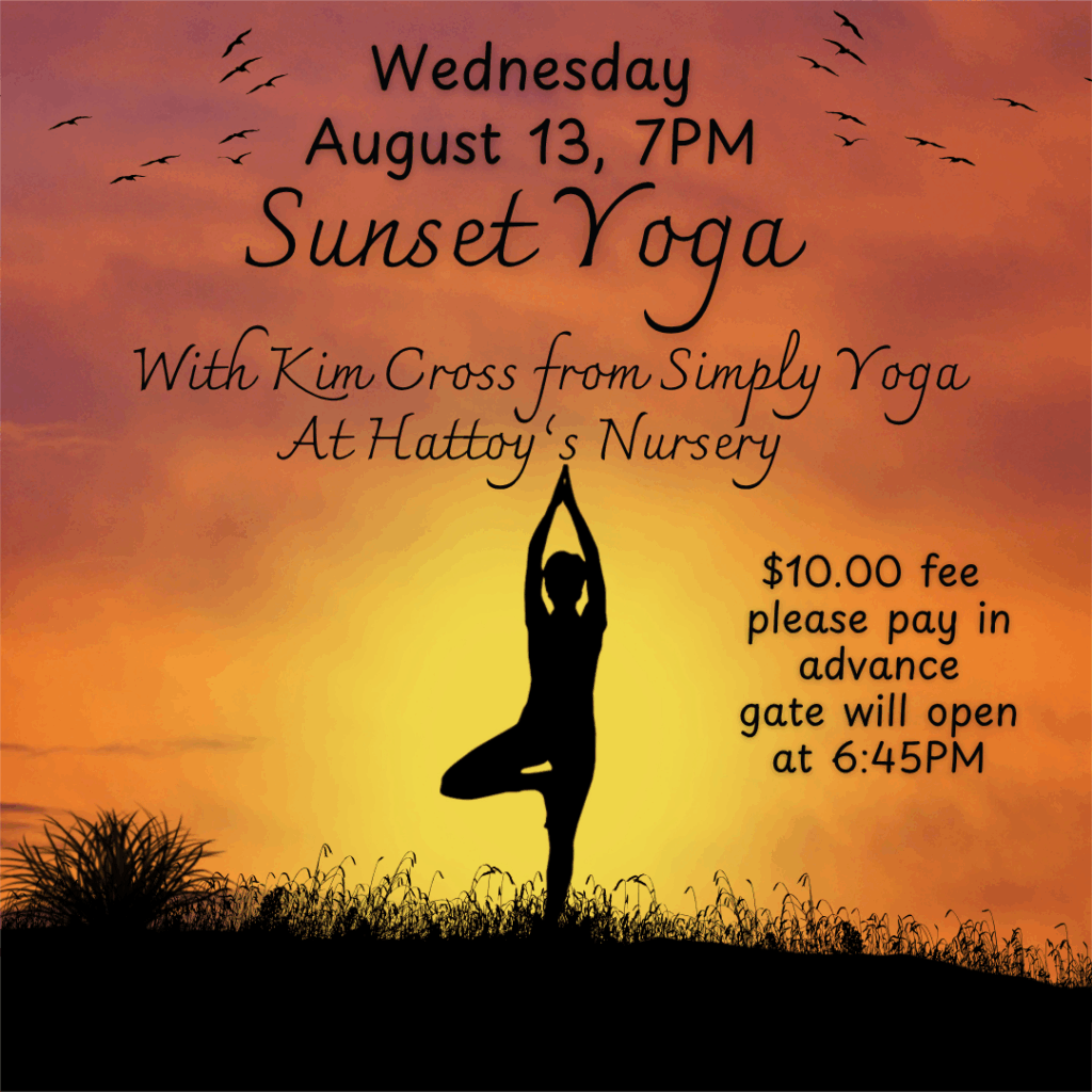 We look forward to doing Yoga with you during sunset at Hattoy’s Nursery! Purchase tickets below and please RSVP with the names of who will be attending if you are buying (1) or multiple tickets so we can have a head count.